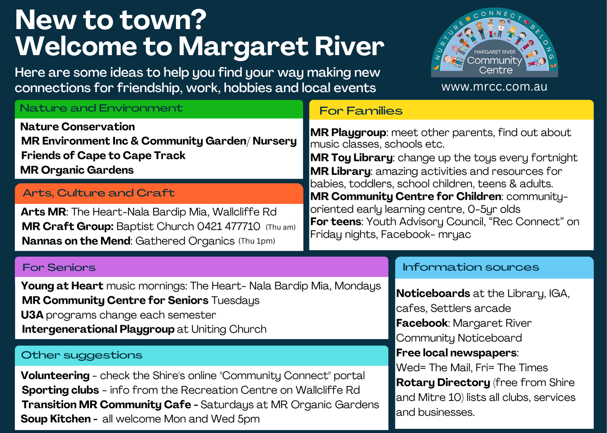 The directory provides up-to-date information for community organisations who provide services in the Augusta Margaret River area.
